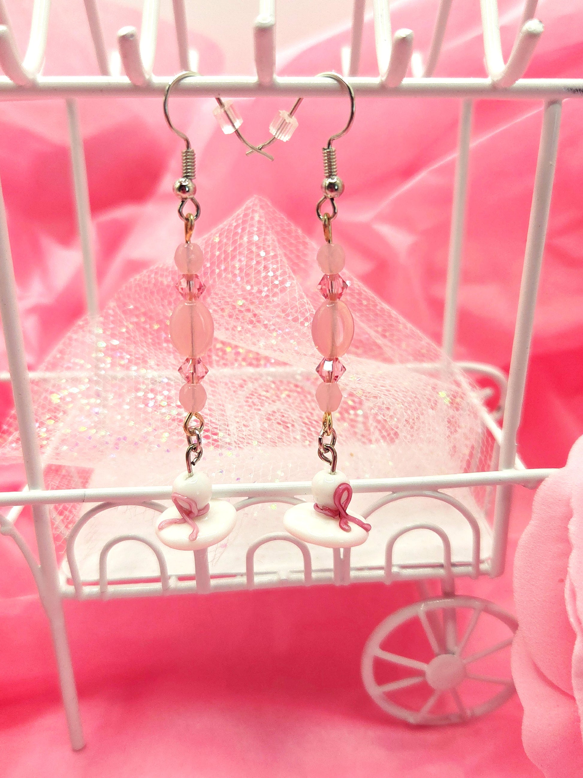 Celebrate style and strength with these whimsical “Diva Hat” earrings, handmade with sparkling pink beads and tiny white hats adorned with the pink ribbon symbol. Lightweight but full of personality, they’re perfect for making a statement of both fashion and awareness.